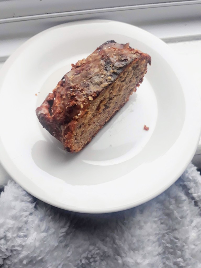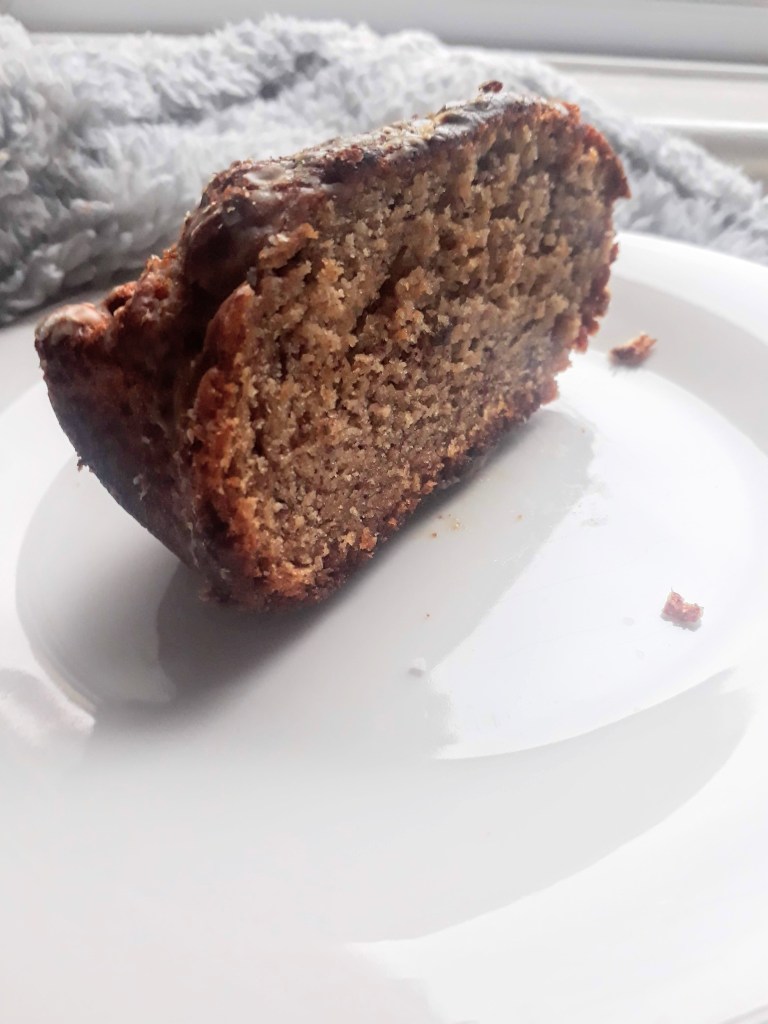 In my opinion, banana bread should be soft inside and crispy on the outside. I achieved this texture by baking it slowly (about 40 minutes at 180C), then drizzling maple and vanilla icing on top.